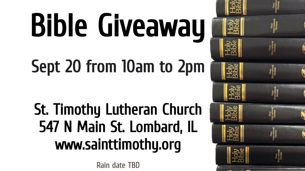 St. Timothy Lutheran Church is giving away a free Bible to anyone in the Lombard community who is interested in the Bible. Just stop by on Sept 20 between 10am and 2pm and ask for your free copy.